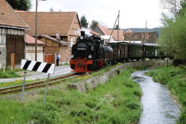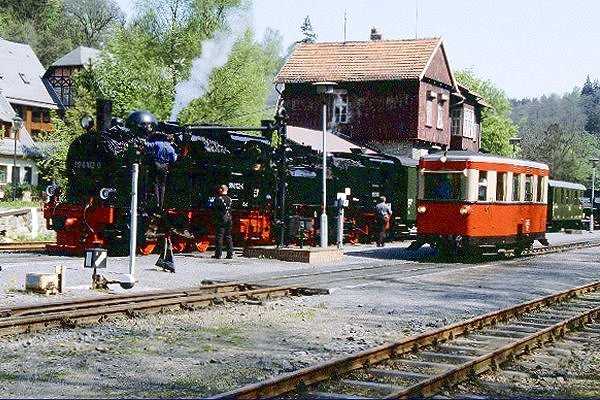 Personenzug mit 99 5906 und Güterzug mit 99 6102 im Bahnhof Alexisbad Foto: Klaus Gottschling Vergrößern 63,0 KB |