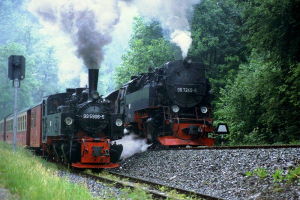 Doppelausfahrt Alexisbad mit Sonderzug (Lok 99 5906) und Planzug (Lok 99 7245) Foto: Klaus Gottschling Vergrößern 76,5 KB |