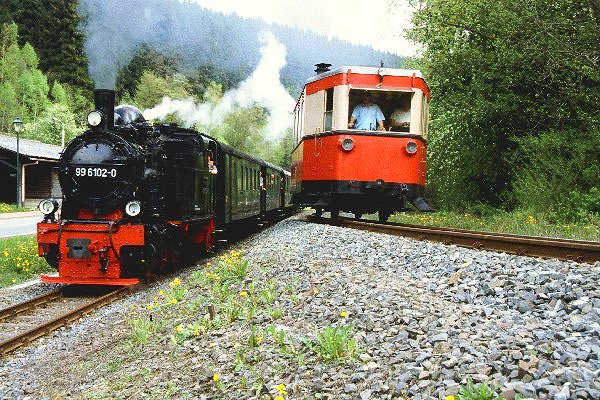 Doppelausfahrt im Bf Alexisbad mit Lok 99 6001 und Triebwagen GHE T1 (187 001)