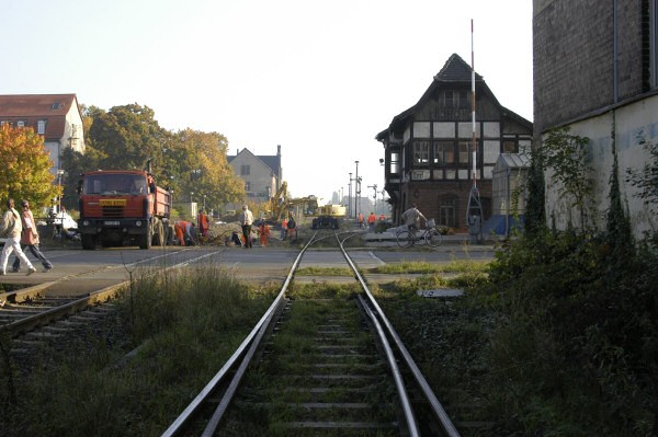 So wie auf der freien Strecke zwischen Gernrode und Quedlinburg mussten auch auf dem Einfahrgleis des Bahnhofs Quedlinburg zunächst der Bewuchs beseitigt und die Bahngräben beräumt werden. Im nächsten Schritt erfolgte das Verlegen von Regelspurweichen im westlichen Bahnhofskopf, um den Platz für das Schmalspurgleis zu schaffen.