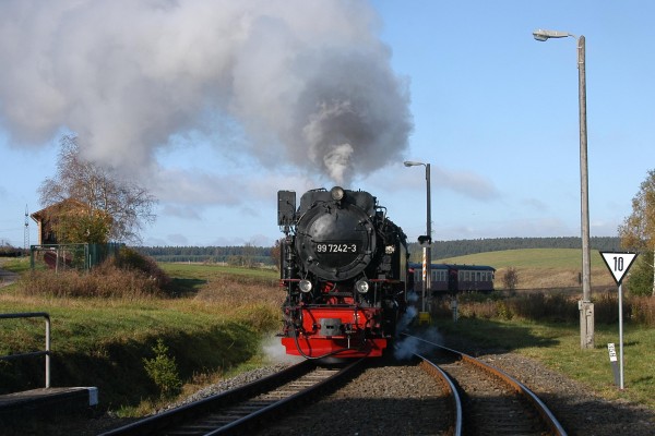 Der Sonderzug zum "Herbstdampf auf den Brocken" war wieder ein langer Zug aus sechs Sitzwagen KB4ip und dem Packwagen KD4i 904-161. Darum wurde die große Lok 99 7242 vorgespannt und der kleine "Fiffi" (Lok 99 6102) fuhr wegen der kaputten 99 5906 im Plandienst.