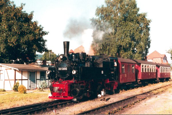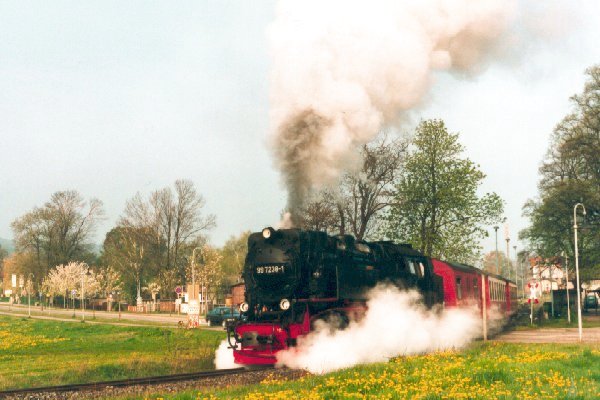 Ausfahrt eines Personenzuges mit Lok 99 7238 aus dem Bf Gernrode Foto: Heiko Fricke Vergrößern 53,5 KB |