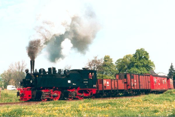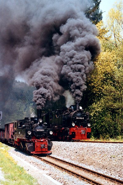 Doppelausfahrt mit den Loks 99 5906 und 99 6102 zur Veranstaltung "Dampfwolken über dem Ramberg" im Mai 2002 Foto: Heiko Fricke Vergrößern 86,6 KB |