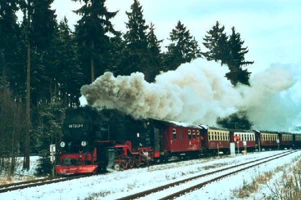 Einfahrt von Lok 99 7243 mit Reisezug in den Bf Drei Annen Hohne Foto: Heiko Fricke Vergrößern 73,8 KB |