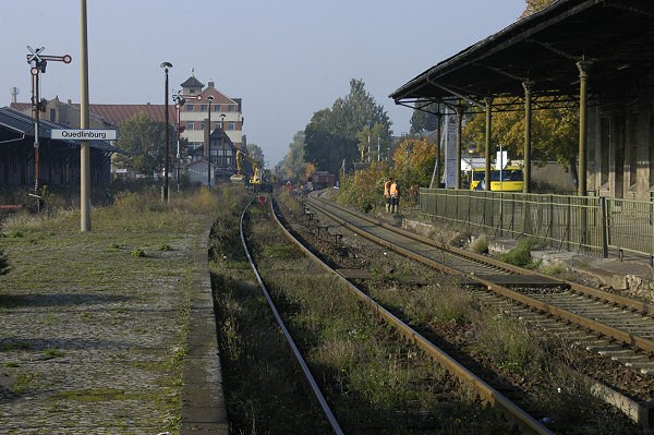 So wie auf der freien Strecke zwischen Gernrode und Quedlinburg mussten auch auf dem Einfahrgleis des Bahnhofs Quedlinburg zunächst der Bewuchs beseitigt und die Bahngräben beräumt werden. Im nächsten Schritt erfolgte das Verlegen von Regelspurweichen im westlichen Bahnhofskopf, um den Platz für das Schmalspurgleis zu schaffen.