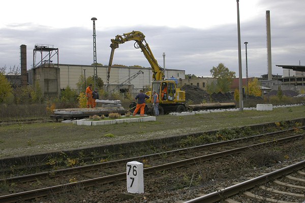 Verteilen von Schmalspurschwellen auf dem Bahnsteig 3 (25.10.2005)