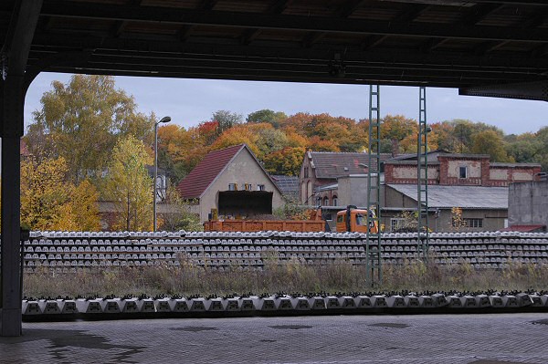 Blick vom Bahnsteig zum Schwellenlager im ehemaligen Gütergleisbereich