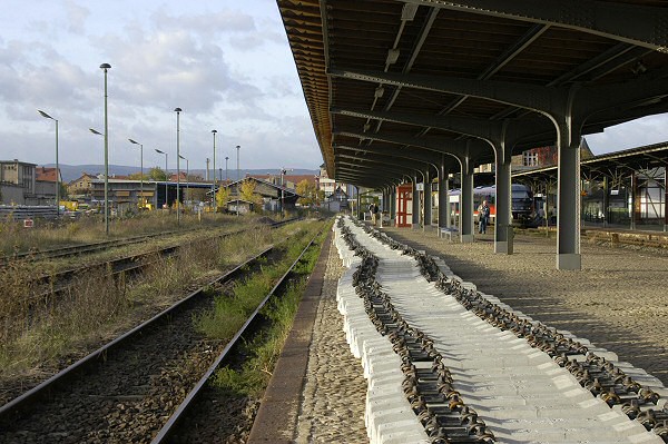 Blick über Bahnsteig 3 mit Schmalspurschwellen