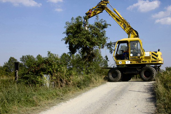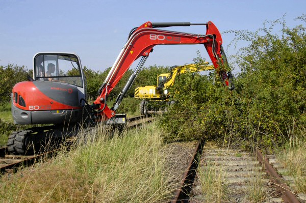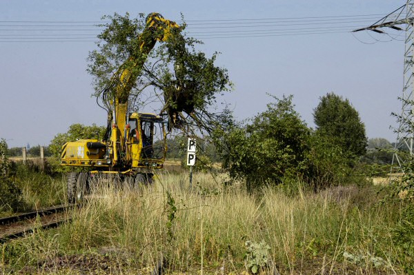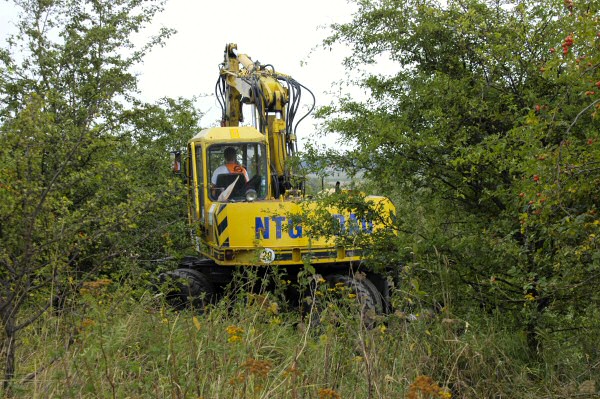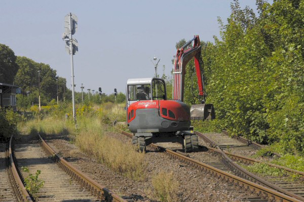 Eine Privatfirma beginnt mit ihrem Bagger im Bereich von Gleis 2 des Bf Bad Suderode mit dem Entfernen des Bewuchses.