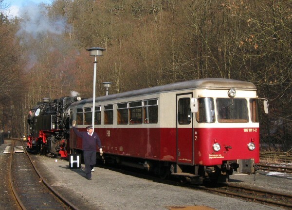 Im Triebwagenumlauf fährt derzeit der 187 013. Der 187 011 wurde am 14.03.2004 zur Hauptuntersuchung nach Wernigerode Westerntor überführt. Zug 8965 nahm am Nachmittag den Tw am Zugschluß von Gernrode nach Alexisbad mit. Nach der Rückkehr aus Harzgerode wurde der 187 011 wieder an den Planzug angehangen. In Stiege erfolgte die Übergabe an den Triebwagen Richtung Nordhausen, welcher den 187 011 in Eisfelder Talmühle an den Zug 8906 (Triebwagen) nach Wernigerode übergab. H. Lencer stellte uns freundlicher Weise ein paar Bilder von der Überführung zur Verfügung.