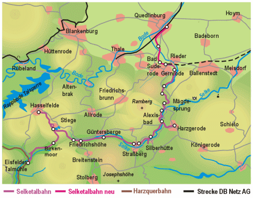 Der Bahnhof besitz ein Nebengleis, welches bei Sonderfahrten zum Ausweichen genutzt wird. Die Talfahrt beginnt ebenso bogenreich wie die Bergfahrt. Mit jedem Kilometer, den der Zug zurücklegt, hat er 25 m an Höhe verloren. Dieser Streckenabschnitt ist der steilste des gesamten Netzes der HSSB. Der Wald wird hin und wieder von einzelnen Wiesen aufgelockert. Links erscheint auf einer Wiese ein Wochenendhaus und spätestens jetzt merkt man, dass dieses das erste Haus seit dem Haltepunkt Osterteich ist. Bis zum Bahnhof Mägdesprung ist keine Siedlung zu sehen. Die Bahn nimmt ungestört ihren Weg und man wird schon nachdenklich, warum nicht der steigungsmäßig günstigere Weg über Ballenstedt, Meisdorf durch das untere Selketal genommen wurde. Zumal hier noch einige Hammerwerke für Gutaufkommen gesorgt hätten. Die Herren zu Anhalt-Ballenstedt wollten aber keine Eisenbahn quer durch ihre hoheitlichen Jagdreviere. Kurz vor dem Bahnhof Mägdesprung geht es vor dem ersten Wegübergang in einem Linksbogen um die Bergkuppe der Heinrichsburg herum. Dann wird zweimal die Bundesstraße B185 gekreuzt. Beide Übergänge wurden in der Vergangenheit mit Sicherungstechnik ausgestattet. Hier in Mägdesprung ließen die früheren Landesherren eine Industrie zur Eisenverarbeitung aufbauen. Bergleute förderten Erz, daß an Ort und Stelle zu Roheisen verarbeitet wurde. Holz und Wasser waren als zweitwichtigste Rohstoffe ebenfalls vorhanden. In Mägdesprung ist nun endlich das Selketal erreicht. Hohe Berghänge, an denen sich Bäume und Fels abwechseln, steigen steil an. Bei dem Felsgestein handelt es sich um Selkegrauwacke, Ablagerungen aus einer Zeit vor etwa 370 Mill. Jahren. Der Höhenunterschied zwischen Tal der Selke und Bergkuppe beträgt bis zu 100 m. Das windungsreiche Tal gibt den weiteren Streckenverlauf vor. Rechts steigt der Hang nach oben und links verläuft die Selke. Bis Alexisbad wird der Zug die rechte Hangseite nicht verlassen. An den Stellen, an denen die natürlichen Bögen zu eng sind, schufen die Erbauer der Bahnlinie mühsam Felsdurchbrüche. Sie waren gerade ausreichend für den Schmalspurzug. Mit dem Einsatz der Diesellokomotiven der Baureihe 1998 mußten diese Ende der 1980er Jahre verbreitert werden. Von der Plattform des letzten Wagens lassen sich die drei kurz vor und nach dem Haltepunkt Drahtzug liegenden Felseinschnitte am besten erleben. Am Haltepunkt Drahtzug hält der Zug sehr selten. Der Lokführer muß hier präzise mit der Plattform des ersten Wagens am Bahnsteig halten, da dieser mit seinen 10 m Länge kürzer ist, als alle derzeit bei der HSB vorhandenen Personenwagen. Immerhin gibt es ein Stationsschild. Der Stationsname erinnert an eine früher vorhandene Drahtzieherei. Auch das Wohnhaus unmittelbar an der Straße vor Drahtzug weist mit dem Namen Stahlhammer auf das alte Gewerbe hin. Hinter Drahtzug, unmittelbar am zweiten Einschnitt (km 12,5), befindet sich der Selkewasserfall. Bald nach dem Passieren des letzten Felseinschnitts am Klosterkopf werden die ersten Häuser von Alexisbad, einem Ortsteil von Harzgerode, sichtbar. Auf einer kurzen Brücke wird an der Klostermühle der Friedenstalbach überquert und gleich danach wird erstmals die Talseite gewechselt. Die Kreuzung mit der Ortsstraße ist wiederum durch eine Halbschrankenanlage gesichert. Hart am Rand der Selke, entlang einer Stützmauer geht es weiter zum Bahnhof. Links sieht man die kleine Kapelle und rechts Ferienheime und Hotels. Dieser Streckenabschnitt mußte übrigens im April 1994 nach einem verheerenden Hochwasser neu aufgebaut werden. Alexisbad ist wohl der berühmteste Bahnhof im Netz der Selketalbahn. Urlauber schwärmen von den Hotels, Spaziergänger und Wanderfreunde von den reizvollen Wanderwegen und Eisenbahnfans von den legendären Doppelausfahrten in Richtung Harzgerode und Silberhütte. Eine Bahn lebt eben hauptsächlich von ihren Fahrgästen. Befahren wir von Alexisbad zunächst den Streckenzweig bis Harzgerode. Nach kurzer paralleler Fahrt zur Strecke nach Stiege geht es über die erste größere Selke-Brücke in ein Seitental in ständiger Bergfahrt weiter. Zweimal wird an gesicherten Wegübergängen die Bundesstraße 185 überquert. Wieder verläuft die Strecke am rechten Berghang. Zwei enge Bögen mußten künstlich dem Fels abgerungen werden. Jedoch nach dem zweiten Wegübergang weitet sich das Tal, der markante viereckige Wasserturm von Harzgerode und die ersten Häuser kommen ins Blickfeld. Vorbei am Juden- und am Hahnröder Teich wird der Ort erreicht. Nach der Querung der Wallstraße wird die letzte kurze Steigung zum Bahnhof genommen. Harzgerode ist erreicht. Ein Gleis zum Umsetzen der Lokomotive genügt. Die alten Anschlußgleise für die örtliche Industrie existieren nicht mehr. Nur das Ladegleis am Güterschuppen ist noch vorhanden. Das Empfangsgebäude war in diesem Baustil bereits in Alexisbad und Mägdesprung zu sehen. Bis Anfang der 1990er Jahre gab es hier den letzten Güterverkehr mit schmalspurigen Fahrzeugen der damaligen Deutschen Reichsbahn (DR). Aluminiumrohlinge wurden nach dem Umladen von Regelspurwagen in Gernrode auf Schmalspurwagen dem "VEB Druckguß- und Kolbenwerke Harzgerode" zugeführt, der daraus Zylinder für die Fahrzeugindustrie fertigte. Das kleine Städtchen ist sehenswert für den Touristen und wer Lust hat, wandert die wenigen Kilometer nach Alexisbad zurück. Die zweite Abfahrt von Alexisbad führt nun wieder im Selketal bergan. Stetig aber sanft steigend verläuft die Strecke an der in Fahrtrichtung rechten Talseite neben der Selke. Unmittelbar um die Selke hat sich ein dichter Erlenbruchwald ausgebreitet. Die Berghänge zeigen sich hingegen immer öfter mit Fichten bewachsen. Ohne größere Ausblicke erreicht der Zug Silberhütte und klettert den Hang hinauf. Unten das Gelände einer pyrotechnischen Fabrik. Eine Brücke, die auf beiden Seiten von einem hohen Zaun flankiert wird führt über eine Werksstraße. Kurz darauf passiert man den vie