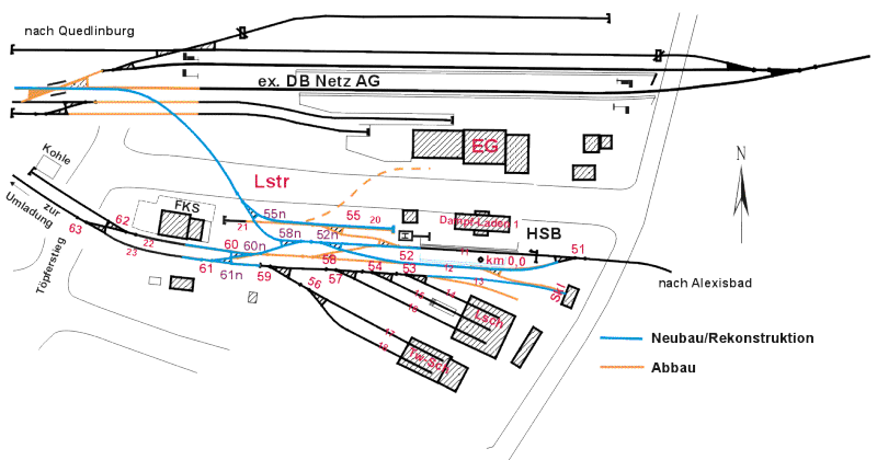Von 1887 bis 2006 war der Bahnhof Gernrode Ausgangspunkt der Selketalbahn und bis 31. Januar 2004 Umsteigestation zwischen Normalspur (Strecke Frose – Quedlinburg) und Schmalspur. Bis April 1990 wurden auch zwischen Wagen beider Spurweiten Güter imgeladen. Dazu dienten die Gleisanlagen, die aus Richtung Quedlinburg kommend rechts von der Bahnhofseinfahrt liegen. Durch das wuchernde Unkraut kann man aber kaum noch die Gleise der ehemaligen „Umladung“ und nur halbwegs die abgestellten Fahrzeuge erkennen.